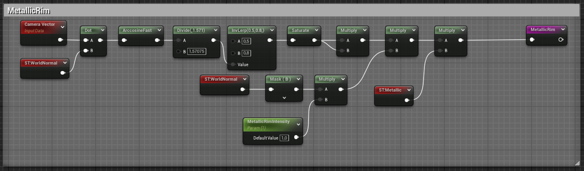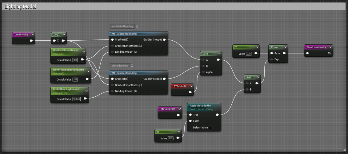 As can be seen in the image below, lighting management on metallic surfaces is handled separately in order to provide greater control to the shader, since metallic surfaces usually have more variability in the lighting gradient, which introduces a greater number of bands than if the same configuration as non-metallic materials were used.