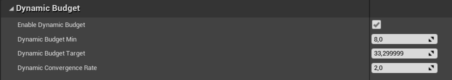 Another highly useful feature is the Dynamic Budget, which adjusts the Animation Budget Allocator’s budget (a.Budget.BudgetMs) based on the current GameThread frametime. It attempts to hit a set target (Dynamic Budget Target) by utilizing spare resources; however, if the frametime exceeds the target, it will begin cutting animation updates to boost performance, down to the Dynamic Budget Min. The Dynamic Convergence Rate is a variable that allows us to adjust how quickly the Budget adapts to current game performance: higher values result in smoother adjustments. It is recommended to modify this only if CPU noise becomes an issue.