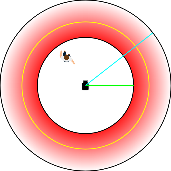 The following diagram visually explains how the fields work: the green radius represents ReductionDistanceGradient.X and the blue radius represents ReductionDistanceGradient.Y. The minimum and maximum points of the gradient are shown in red. The yellow line corresponds to the distance of the parameterized ReductionParameterLevel: 0 equals the minimum and 1 equals the maximum. Beyond this distance, the number of Ticks executed by the Character’s components is reduced.